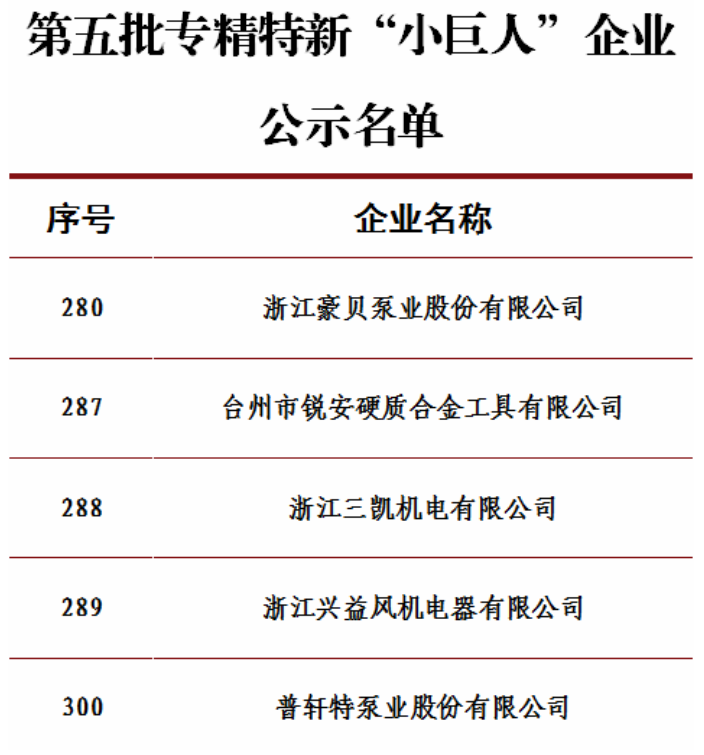 7月14日,浙江省经信厅公布第五批专精特新"小巨人"名单(公示),我市豪泵业、兴益风机、锐安硬质、三凯机电、普轩特泵业等5家企业名列其中。