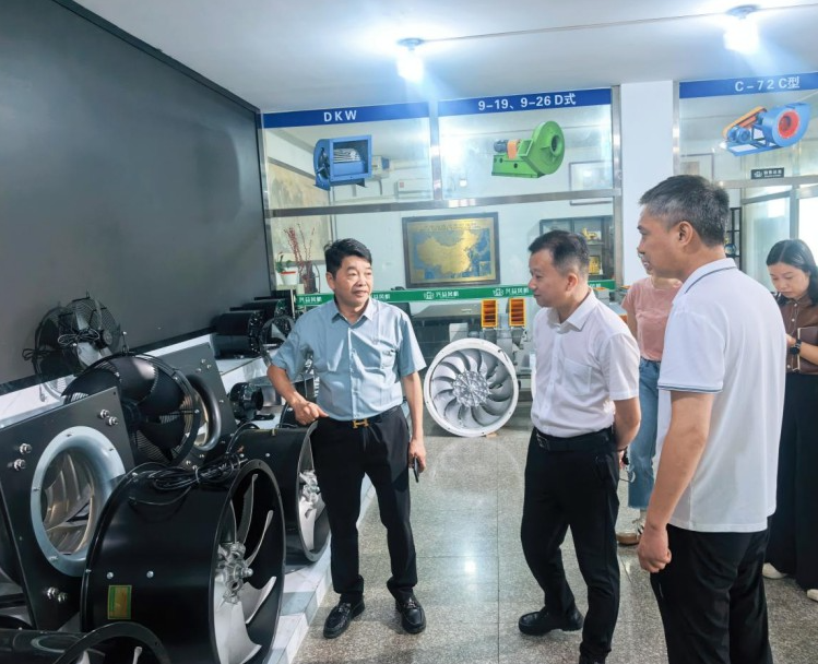 接着,领导们参观了公司的样品室。样品室里陈列着公司多年来生产的各类风机产品,款式多样,功能各异。应友春董事长逐一介绍了每款产品的特点和应用领域,姜书记和金镇长认真倾听,不时提出一些专业的问题,应友春董事长都一一进行了详细解答。