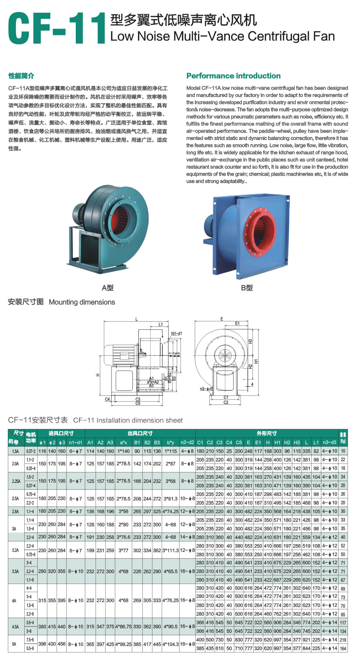 * CF-11A型低噪声多翼离心式通风机是本公司为适应日益发展的净化工 业及环保降噪的需要而设计制作的。风机在设计时采用噪声、效率等各项气动参数的多目标优化设计方法,实现了整机的最佳性能匹配。具有良好的气动性能,叶轮及皮带轮均经严格的动平衡校正,故运转平稳、噪声低、流量大、振动小、寿命长等特点。