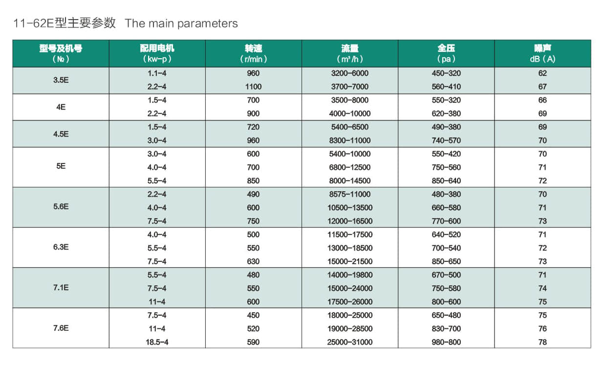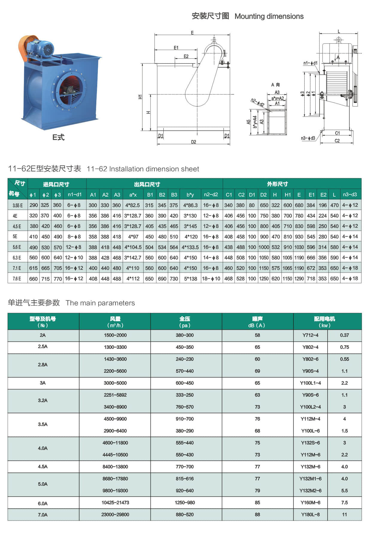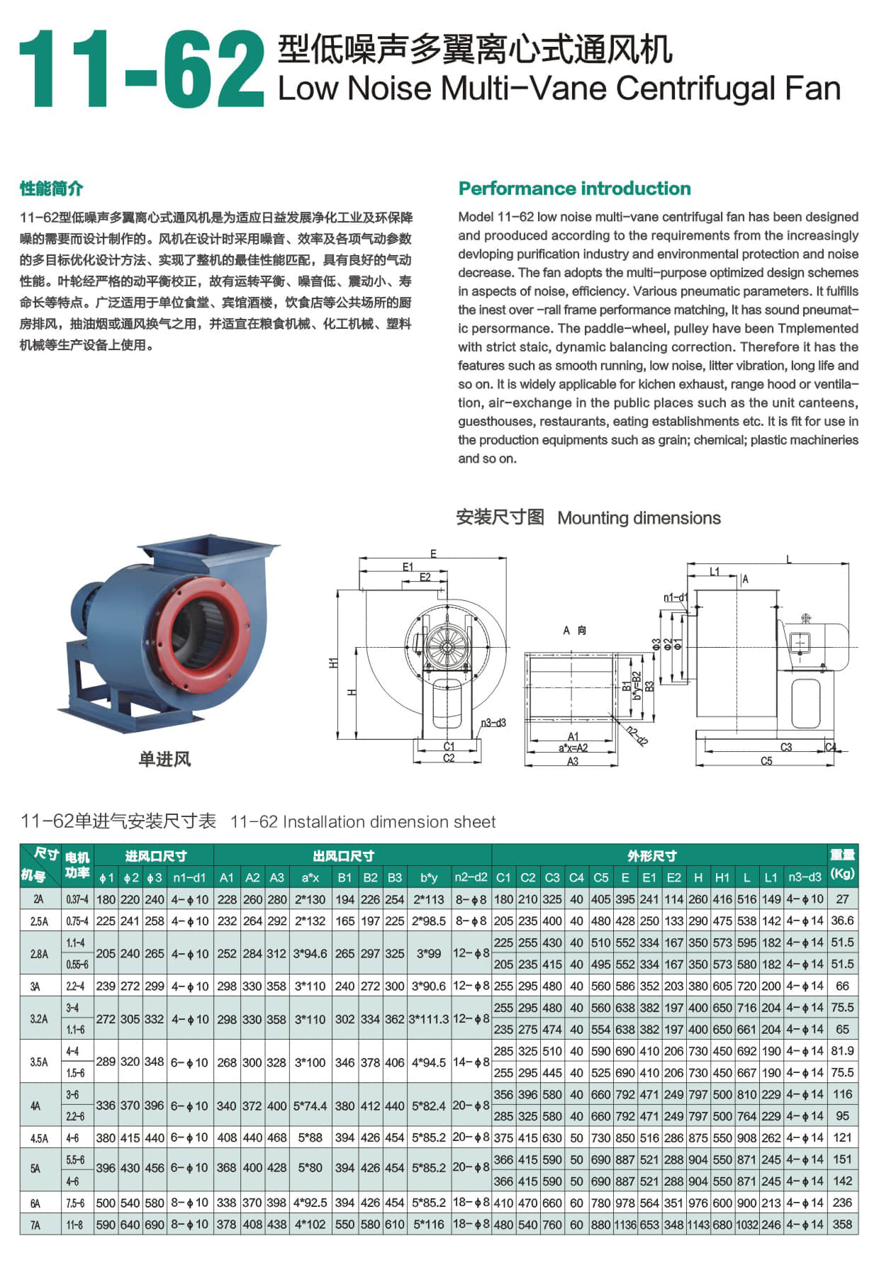 * 11-62型低噪声多翼离心式通风机是为适应日益发展净化工业及环保降 噪的需要而设计制作的。风机在设计时采用噪音、效率及各项气动参数 的多目标优化设计方法、实现了整机的最佳性能匹配,具有良好的气动性能。叶轮经严格的动平衡校正,故有运转平衡、噪音低、震动小、寿命长等特点。广泛适用于单位食堂、宾馆酒楼,饮食店等公共场所的厨房排风,抽油烟或通风换气之用,并适宜在粮食机械、化工机械、塑料机械等生产设备上使用。