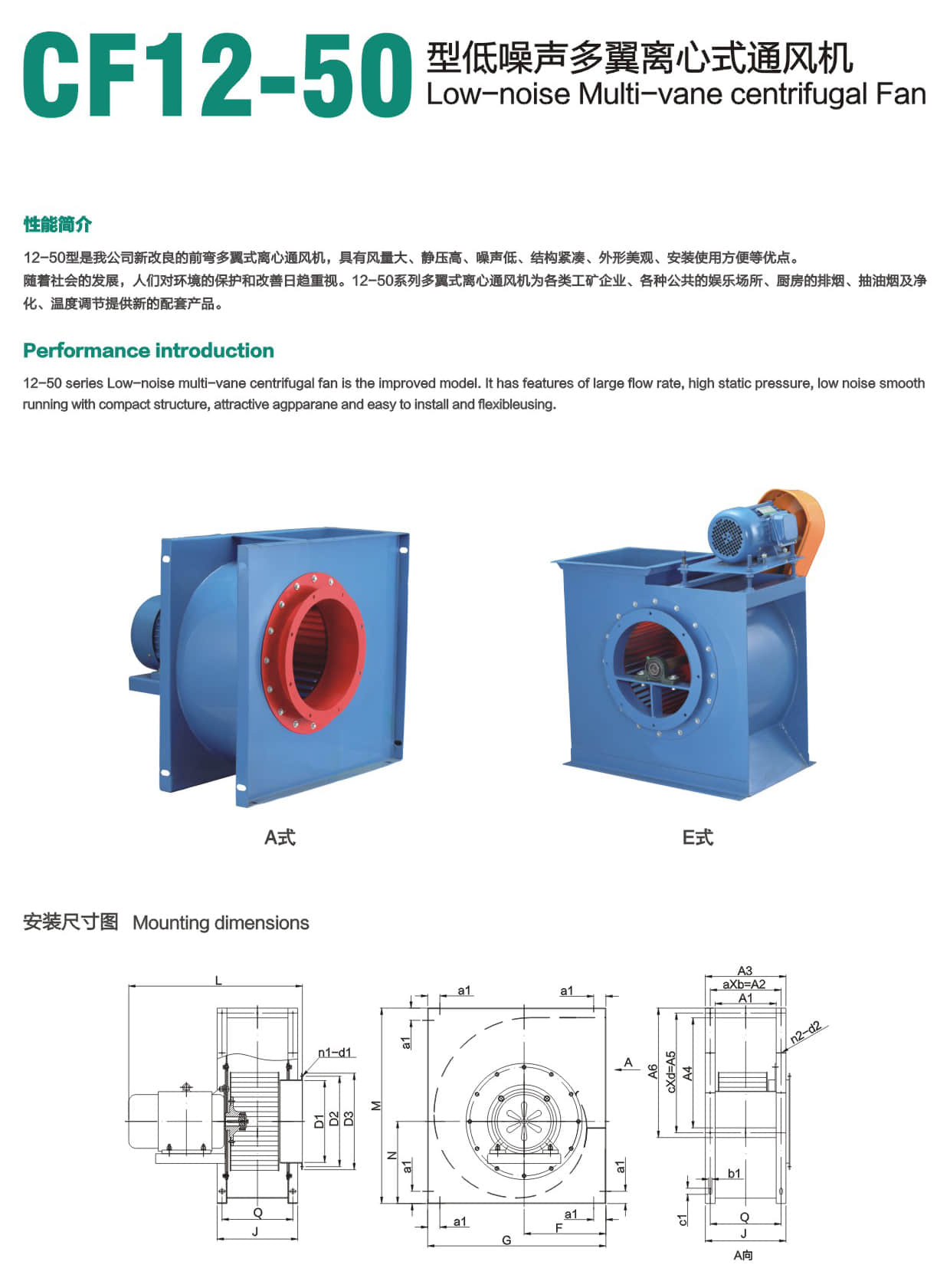 * 12-50型是我公司新改良的前弯多翼式离心通风机,具有风量大、静压高、噪声低、结构紧凑、外形美观、安装使用方便等优点。 随着社会的发展,人们对环境的保护和改善日趋重视。12-50系列多翼式离心通风机为各类工矿企业、各种公共的娱乐场所、厨房的排烟、抽油烟及净化、温度调节提供新的配套产品。