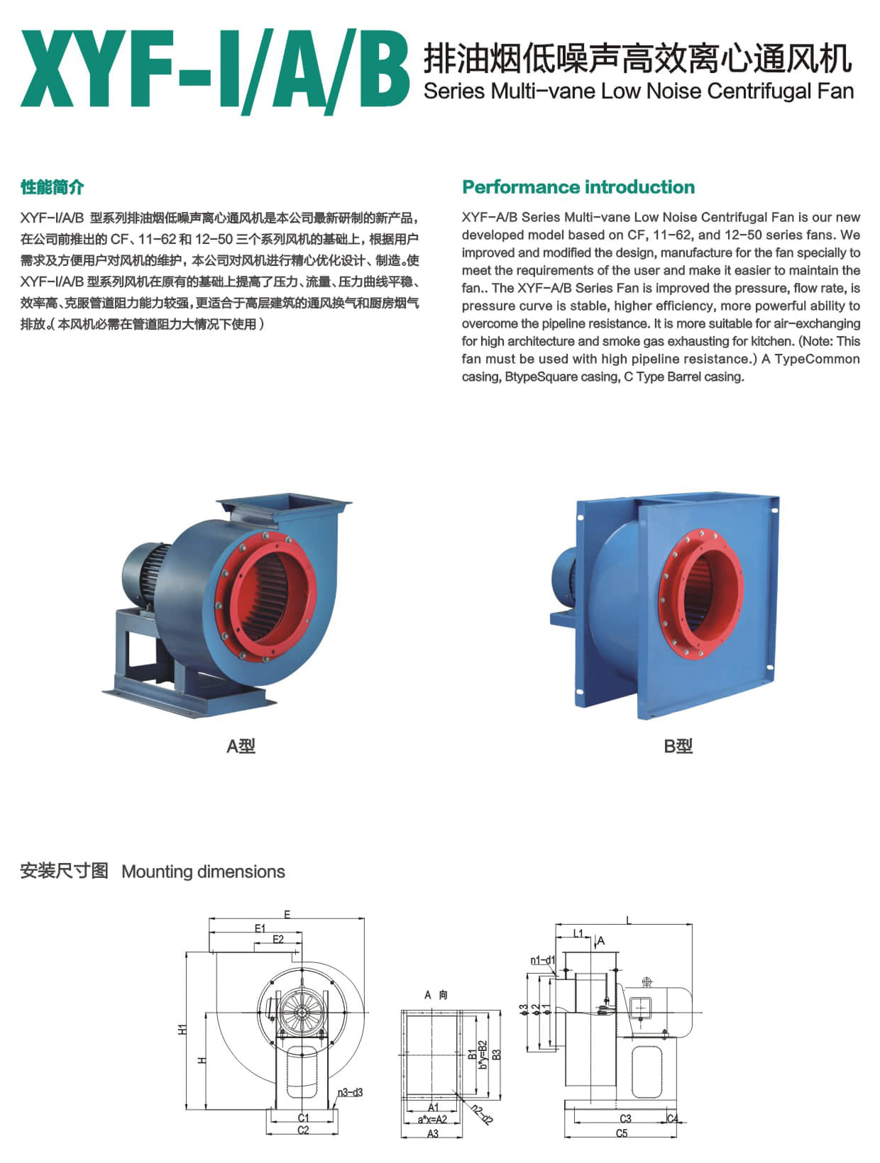 * XYF-I/A/B型系列排油烟低噪声离心通风机是本公司最新研制的新产品,在公司前推出的CF、11-62和12-50三个系列风机的基础上,根据用户 需求及方便用户对风机的维护,本公司对风机进行精心优化设计、制造。使 XYF-I/A/B 型系列风机在原有的基础上提高了压力、流量、压力曲线平稳、 效率高、克服管道阻力能力较强,更适合于高层建筑的通风换气和厨房烟气 排放。(本风机必需在管道阻力大情况下使用)