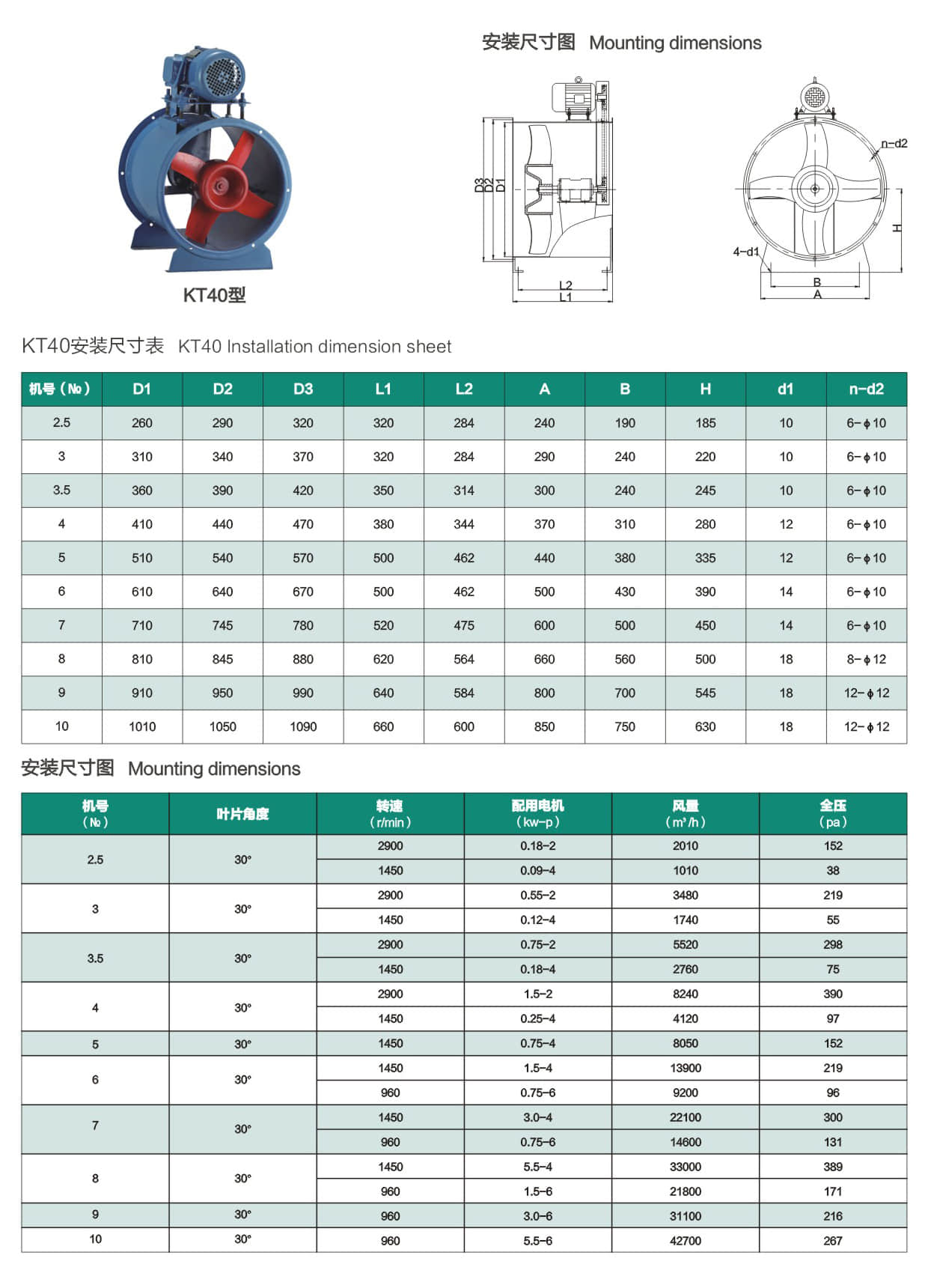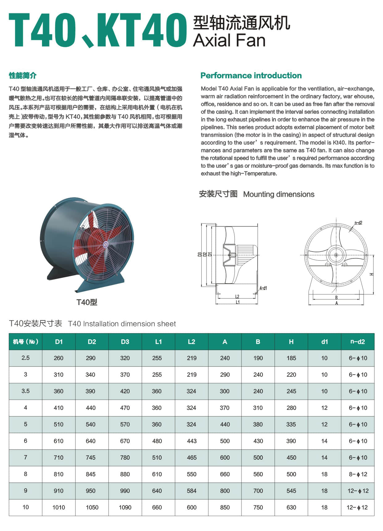* 本系列产品可根据用户的需要,在结构上采用电机外置(电机在机壳上)皮带传动,型号为 KT40,其性能参数与T40风机相同,也可根据用户需要改变转速达到用户所需性能,其最大作用可以排送高温气体或潮湿气体。