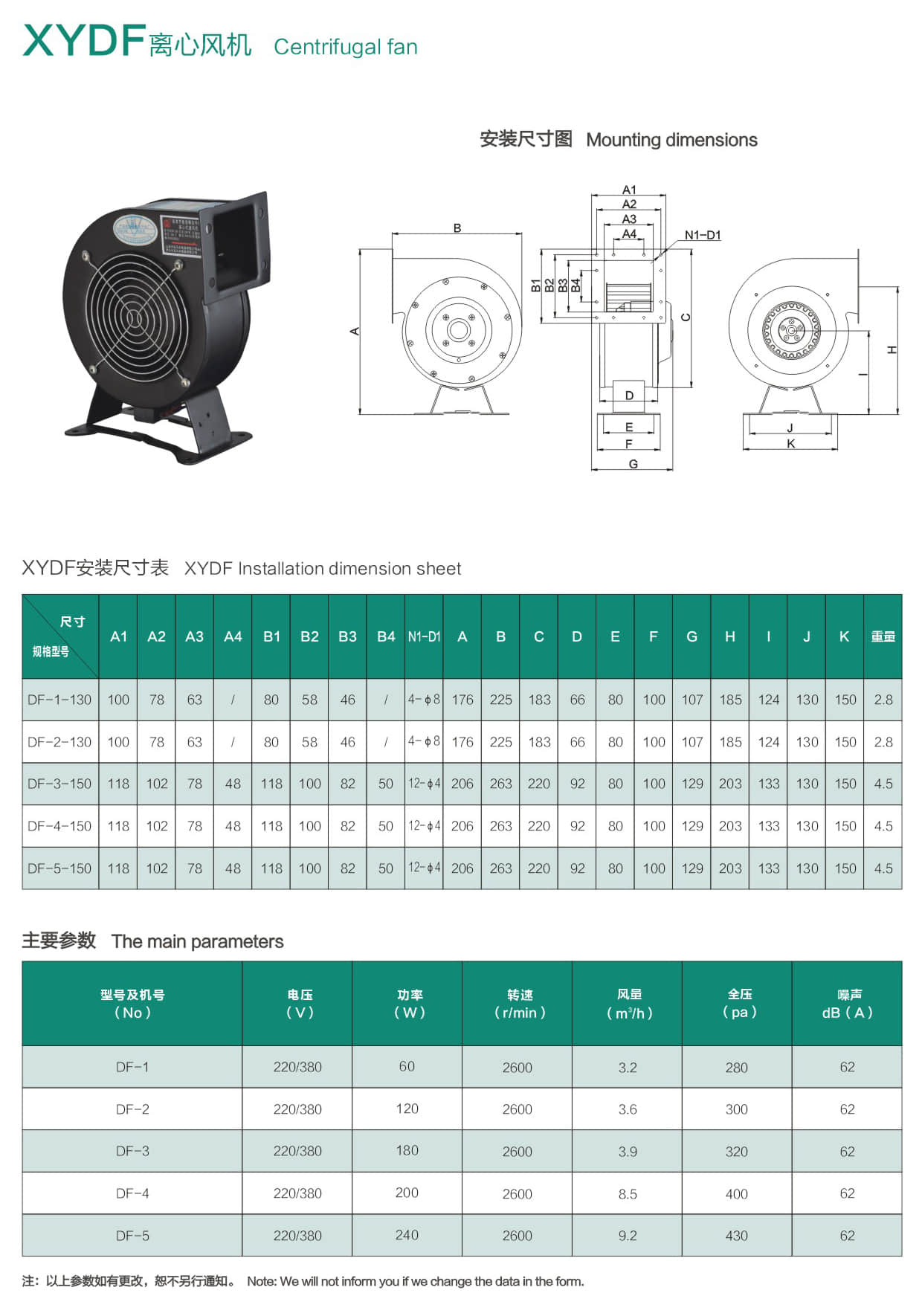* XYDF系列离心风机的绝缘等级为B 级、F 级。
