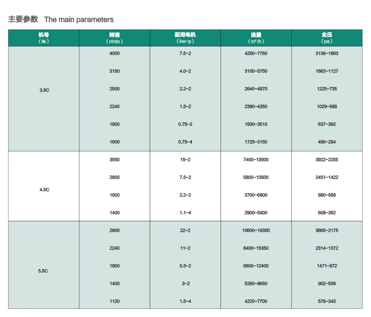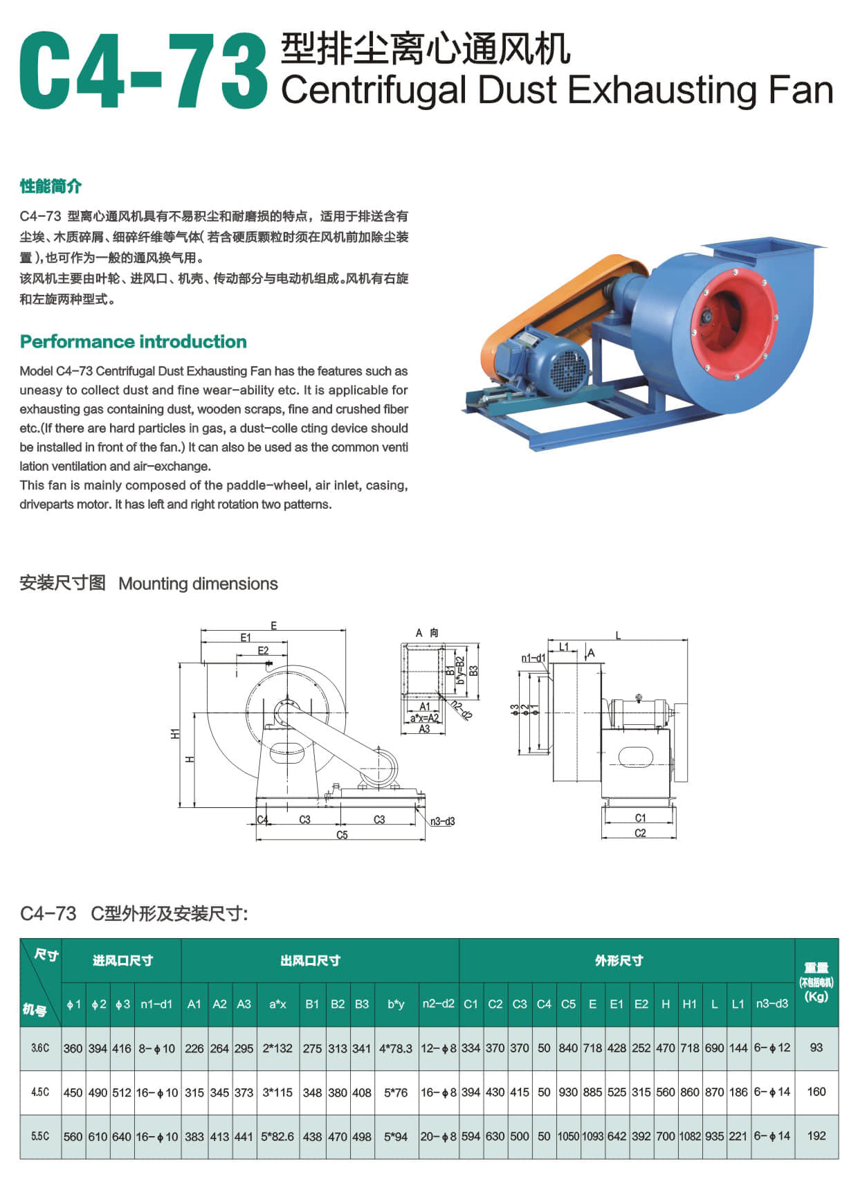 * C4-73型离心通风机具有不易积尘和耐磨损的特点,适用于排送含有尘埃、木质碎屑、细碎纤维等气体(若含硬质颗粒时须在风机前加除尘装置),也可作为一般的通风换气用。*该风机主要由叶轮、进风口、机壳、传动部分与电动机组成。风机有右旋和左旋两种型式。