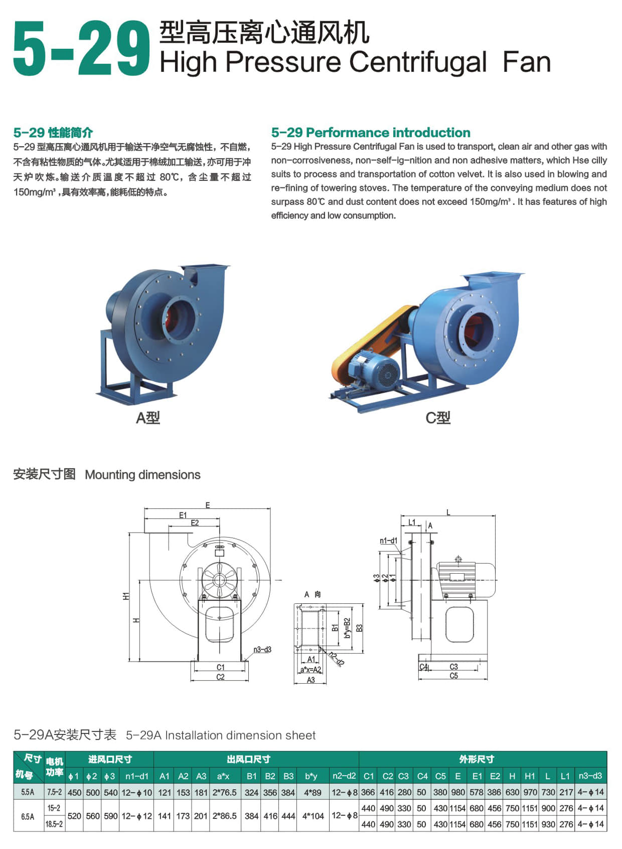 * 5-29型高压离心通风机用于输送下净空气无腐蚀性,不自燃,不含有粘性物质的气体。尤其适用于棉绒加工输送,亦可用于冲天炉吹炼。输送介质温度不超过80℃,含尘量不超过150mg/m³,具有效率高,能耗低的特点。
