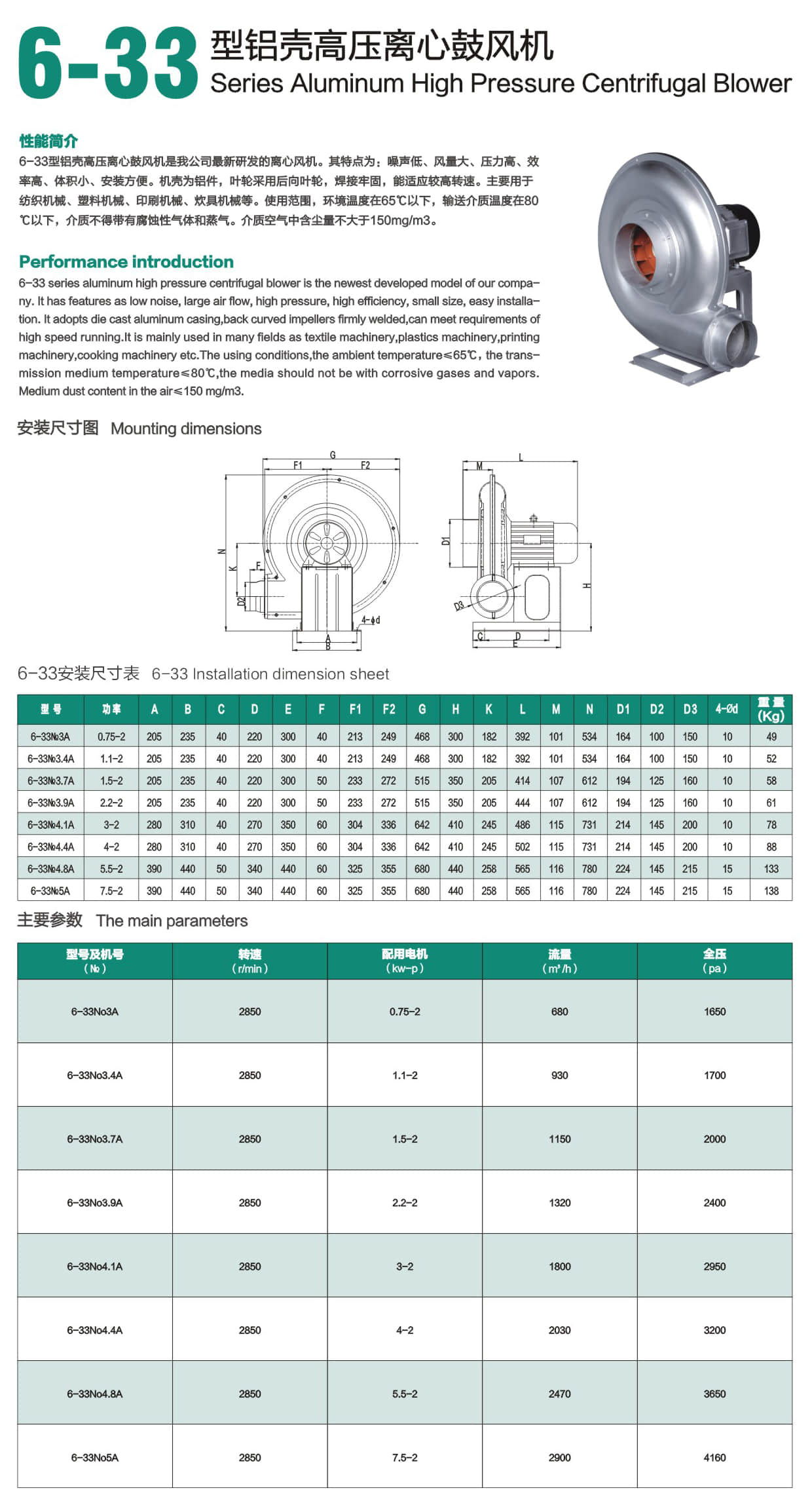 * 6-33型铝壳高压离心鼓风机是我公司最新研发的离心风机。其特点为:噪声低、风量大、压力高、效率高、体积小、安装方便。机壳为铝件,叶轮采用后向叶轮,焊接牢固,能适应较高转速。主要用于纺织机械、塑料机械、印刷机械、炊具机械等。使用范围,环境温度在65℃以下,输送介质温度在80℃以下,介质不得带有腐蚀性气体和蒸气。介质空气中含尘最不大于150mg/m3。