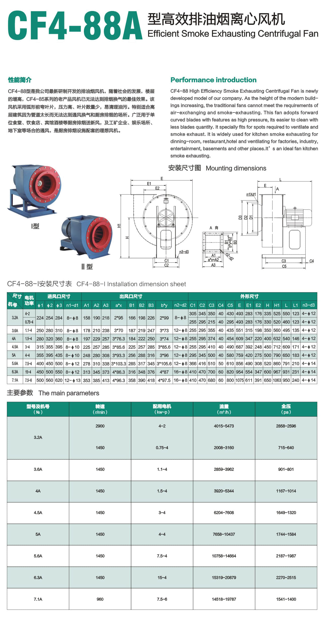* CF4-88型是我公司最新研制开发的排油烟风机,随着社会的发展,楼层的增高,CF4-85系列的老产品风机已无法达到排烟换气的最佳效果。该风机采用弧形前弯叶片,压力高、叶片数量少,易清理油污。特别适合高层建筑因为管道太长而无法达到通风换气和厨房排烟的场所。广泛用于单位食堂、饮食店、宾馆酒楼等厨房排烟送新风,及工矿企业、娱乐场所、地下室等场合的通风,是厨房排烟设施配套的理想风机。