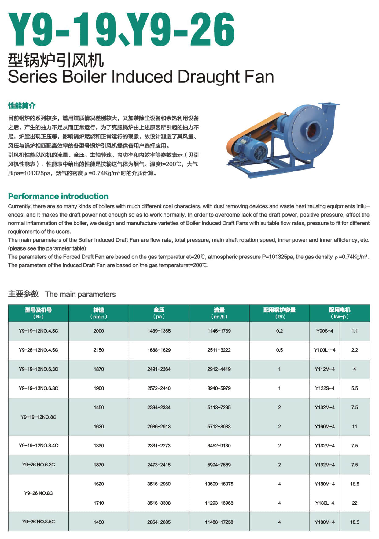 * 目前锅炉的系列较多,燃用煤质情况差别较大,又加装除尘设备和余热利用设备之后,产生的抽力不足从而正常运行,为了克服锅炉由上述原因所引起的抽力不足,炉膛出现正压等,影响锅炉燃烧和正常运行的现象,故设计制造了其风且、风压与锅炉相匹配高效率的各型号锅炉引风机提供各用户选择应用。